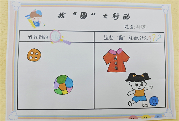 神奇的圓給我們的生活帶來了哪些作用呢?為了滿足孩子們的探究欲望,我們還進(jìn)行了找“圓”大行動調(diào)查表,在家長們的協(xié)助下,孩子們對圓圓的物品有了更深刻的認(rèn)知。