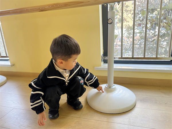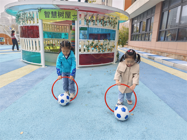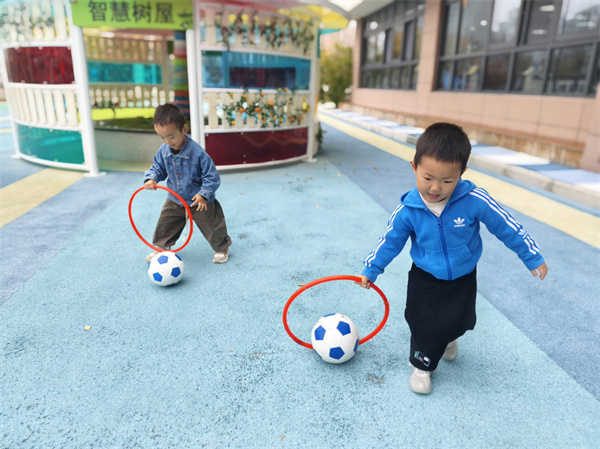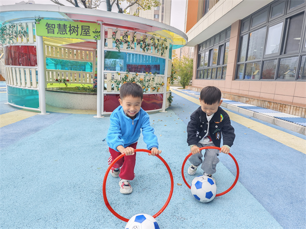 把呼啦圈和球放在一起也能玩哦!看,孩子們把球放在呼啦圈里,拉著球往前走,玩起了“趕小豬”游戲。