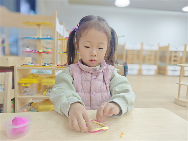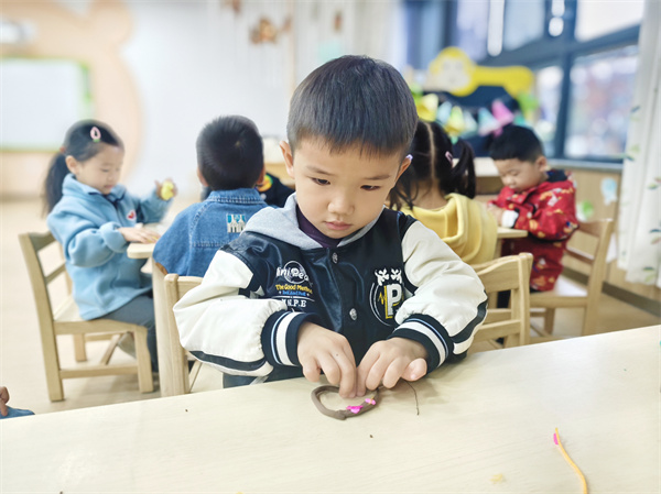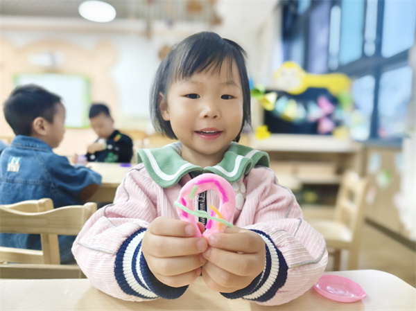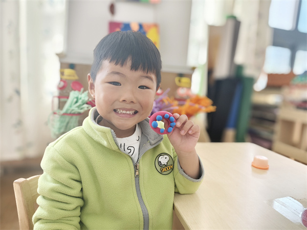 幼兒在探索“圓”的過程中充分發(fā)揮想象力,用自己喜愛的方式進(jìn)行美術(shù)創(chuàng)作。甜甜圈可是小朋友們的最愛,粘土搓成長條繞成一個(gè)圓,用各種顏色的小紙片、小細(xì)繩進(jìn)行裝飾,多種口味的“甜甜圈”出鍋嘍。