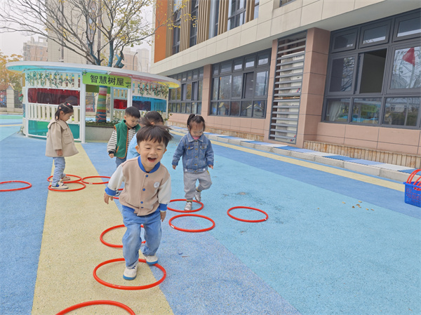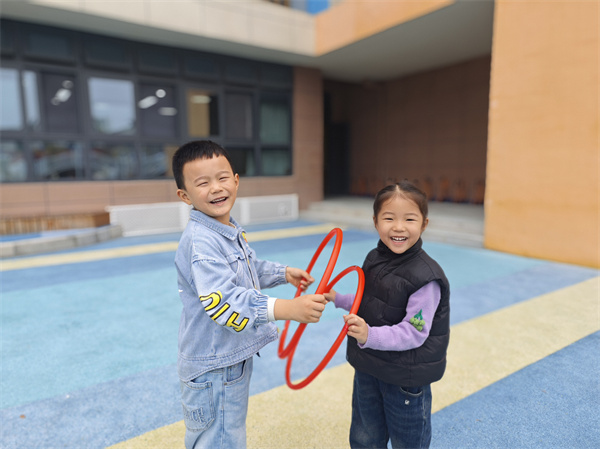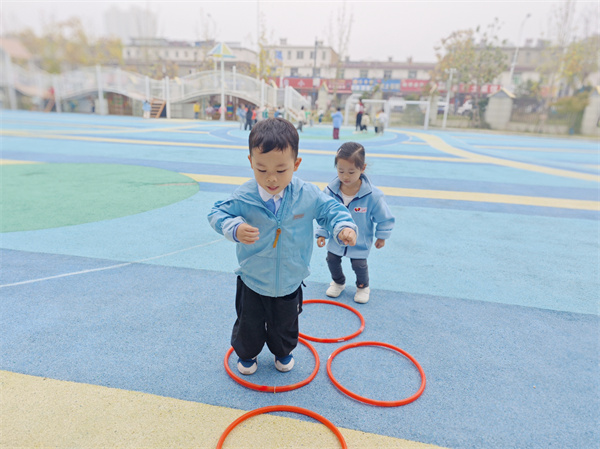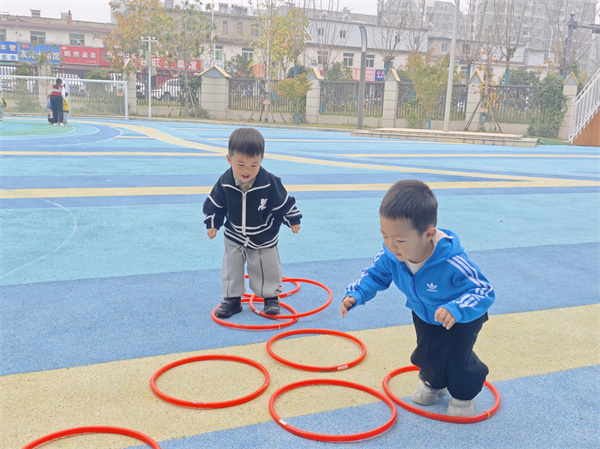 跳圓圈是孩子們最喜歡的,在“加油”聲中,孩子們大顯身手,擺出來各式各樣的不同玩法,瞬間讓游戲更有趣了。