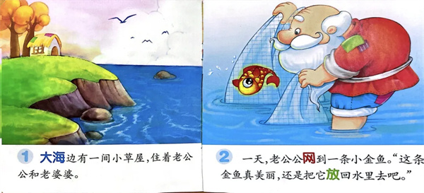 大海邊有一間小草屋,住著老公公和老婆婆。一天,老公公網(wǎng)到一條小金魚。“這條金魚真美麗,還是把它放回水里去吧?!?/p>