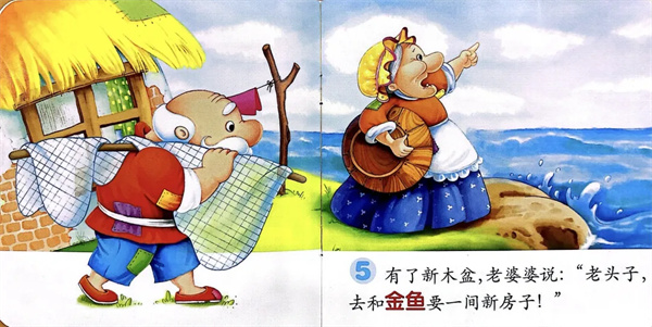 有了新木盆,老婆婆說:“老頭子,去和金魚要一間新房子!”