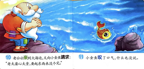 老公公來到大海邊,又向小金魚請求:“老太婆心太貪,要起東西來沒個完?!毙〗痿~嘆了口氣,什么也沒說。