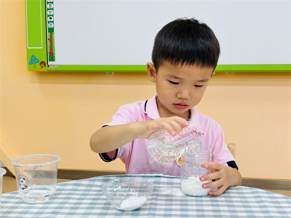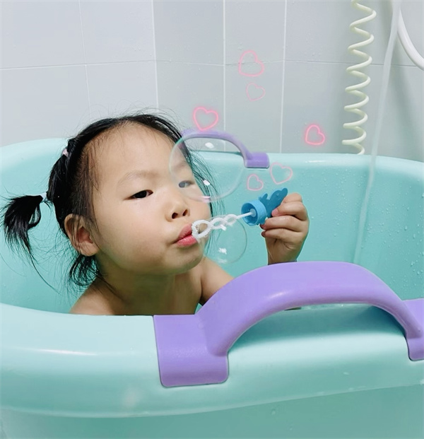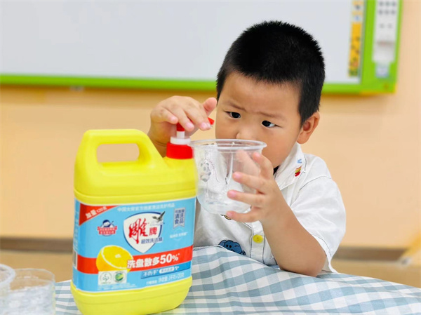 孩子們通過(guò)動(dòng)手操作實(shí)驗(yàn)發(fā)現(xiàn),在適量清水中加入我們生活中常見(jiàn)的洗手液、洗潔精、洗衣粉等都可以做出泡泡水,但是比例要合理,并且為了吹出的泡泡更加堅(jiān)韌不易破,我們還可以加入了白糖。