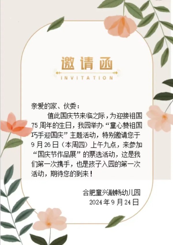 為進一步喜迎國慶75周年,激發(fā)幼兒的愛黨愛國的情懷,培養(yǎng)幼兒愛祖國、愛家鄉(xiāng)、愛人民的情感,激發(fā)創(chuàng)意思維,鍛煉孩子們的動手能力,增進孩子和家長的親子感情。2024年9月26日,合肥市童興融暢幼兒園開展了“童心贊祖國 巧手迎國慶”親子作品展示活動,為祖國媽媽獻上了一份真誠的生日賀禮。