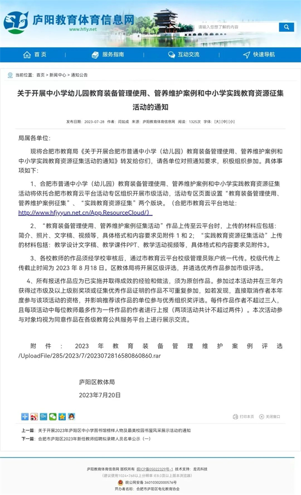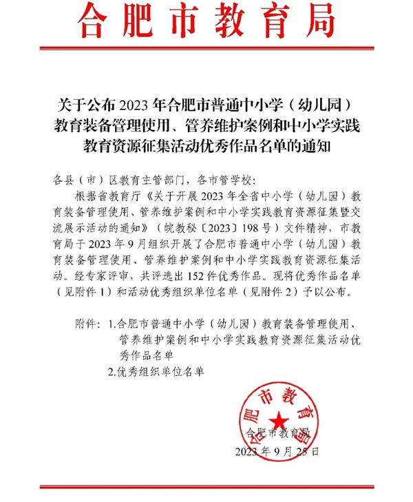 為更好地管理、維護(hù)、使用教育裝備,推廣好的經(jīng)驗和做法,不斷提高普通中小學(xué)(幼兒園)教育裝備的管理應(yīng)用水平,進(jìn)一步完善中小學(xué)信息化設(shè)備運(yùn)維保障機(jī)制,推進(jìn)學(xué)校教育技術(shù)裝備與教育教學(xué)深度融合。合肥市開展了普通中小學(xué)(幼兒園)教育裝備管理使用、管養(yǎng)維護(hù)案例和中小學(xué)實踐教育資源征集活動。