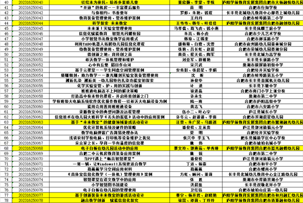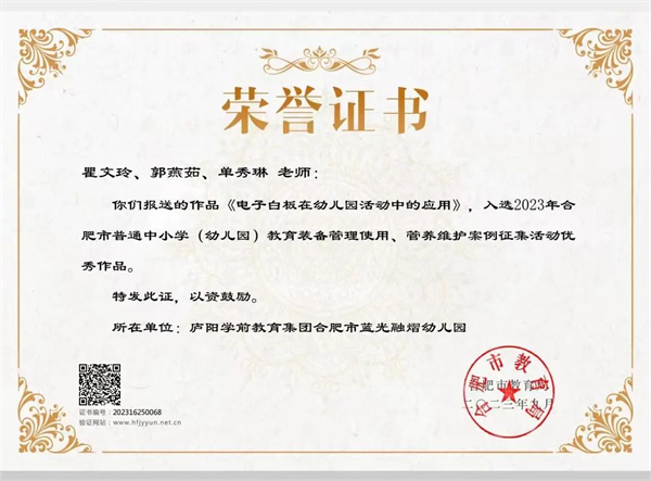 合肥市藍(lán)光融熠幼兒園瞿文玲、郭燕茹、單秀琳《電子白板在幼兒園活動中的應(yīng)用》作品入選合肥市2023年中小學(xué)(幼兒園)教育裝備管理使用、管養(yǎng)維護(hù)案例展示活動。