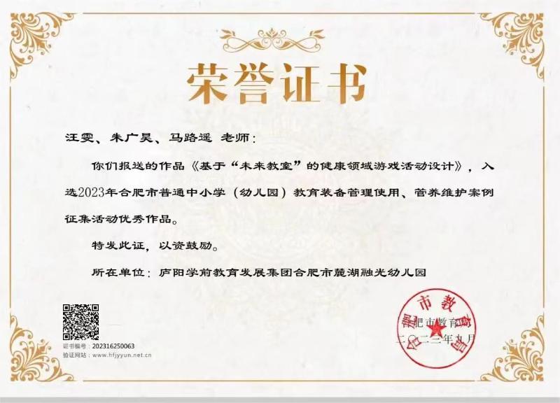 合肥市麓湖融光幼兒園汪雯、朱廣昊《基于創(chuàng)新裝備朱來教空的游戲活動(dòng)設(shè)計(jì)》作品入選合肥市2023年中小學(xué)(幼兒園)教育裝備管理使用、管養(yǎng)維護(hù)案例展示活動(dòng)。