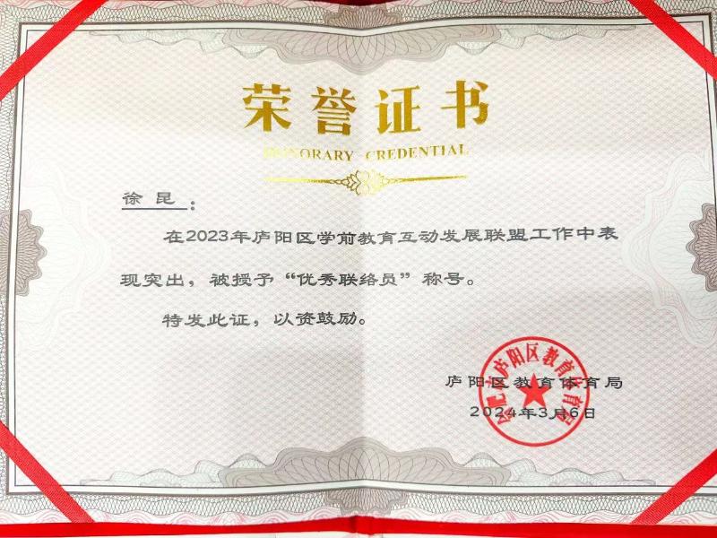 廬陽學(xué)前教育集團清源融和園:執(zhí)行園長徐昆在2023年廬陽區(qū)學(xué)前教育互動發(fā)展聯(lián)盟工作中表現(xiàn)突出,被授予“優(yōu)秀聯(lián)絡(luò)員”稱號