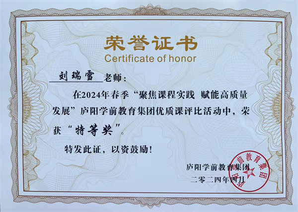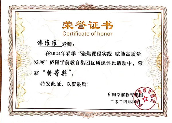 廬陽學(xué)前教育集團(tuán)和月融匯園:劉瑞雪、傅維維、張軍霞老師在2024年春季“聚焦課程實踐 賦能高質(zhì)量發(fā)展”廬陽學(xué)前教育集團(tuán)優(yōu)質(zhì)課評比活動中分別榮獲特等獎、特等獎、一等獎