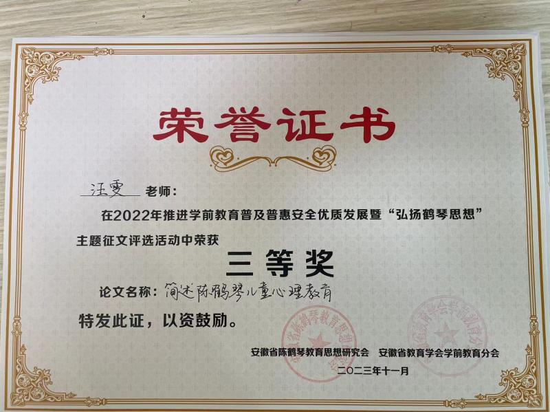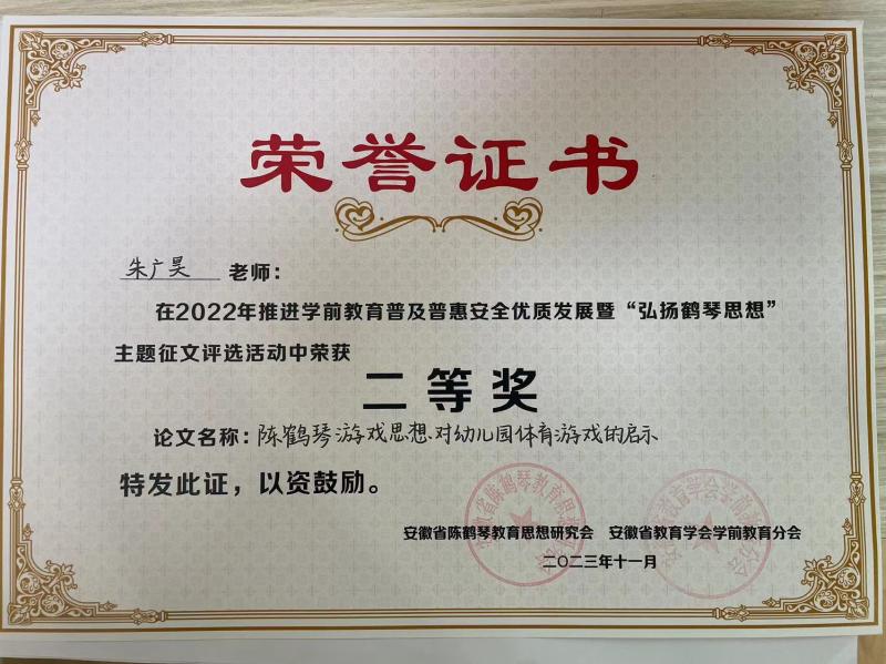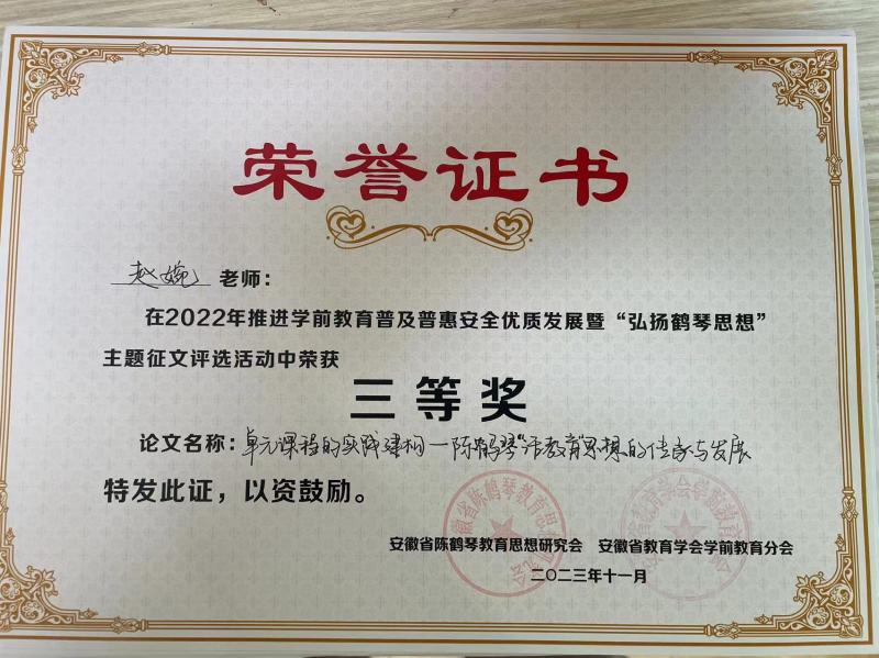 廬陽學(xué)前教育集團(tuán)麓湖融光園:朱廣昊、趙婉、汪雯在2022年推進(jìn)學(xué)前教育普及普惠安全優(yōu)質(zhì)發(fā)展暨“弘揚(yáng)鶴琴思想” 主題征文評(píng)選活動(dòng)中分別榮獲二等獎(jiǎng)、三等獎(jiǎng)、三等獎(jiǎng)