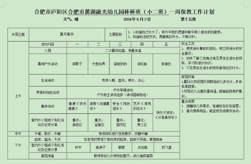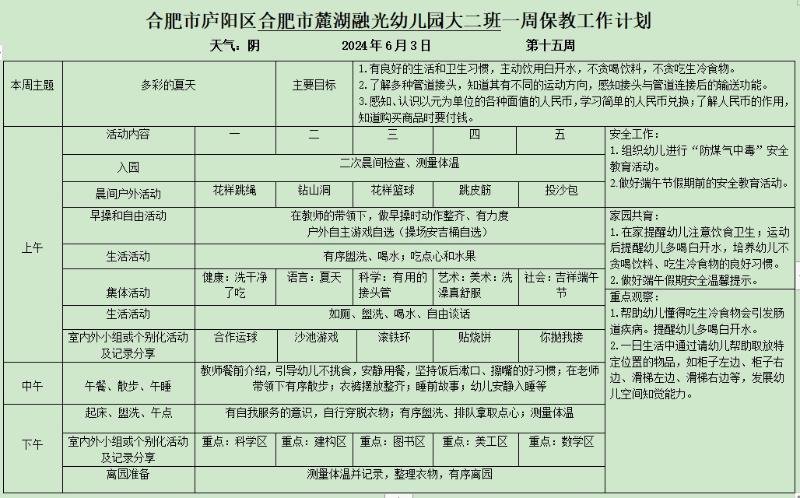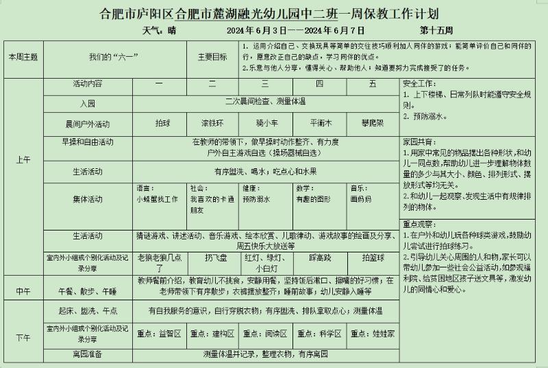 廬陽(yáng)學(xué)前教育集團(tuán)麓湖融光園:六月份第一周周計(jì)劃