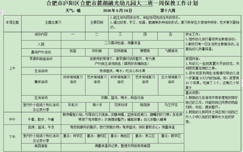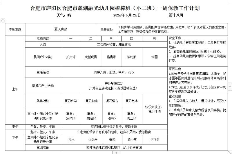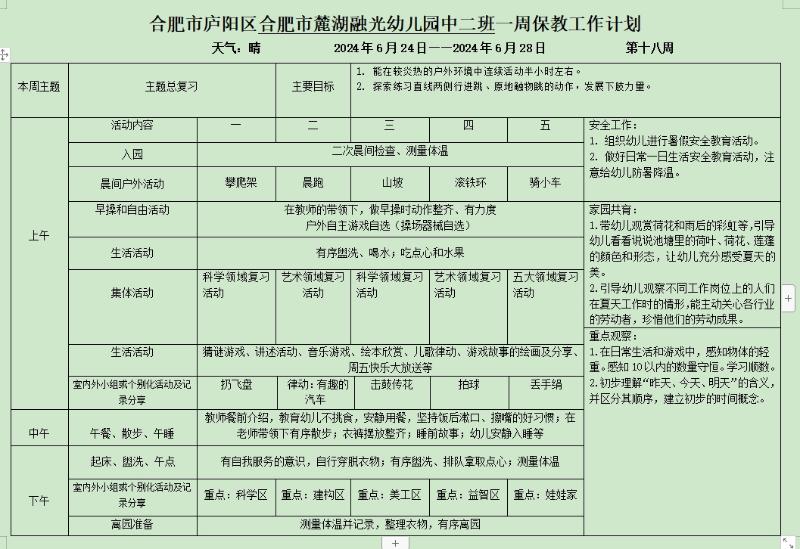 廬陽學(xué)前教育集團(tuán)麓湖融光園:六月份第四周周計(jì)劃