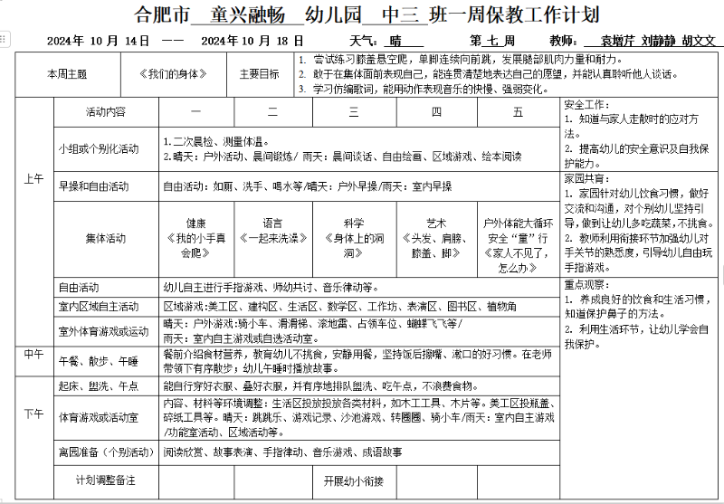 廬陽教育發(fā)展集團童興融暢園:中班第七周保教工作計劃
