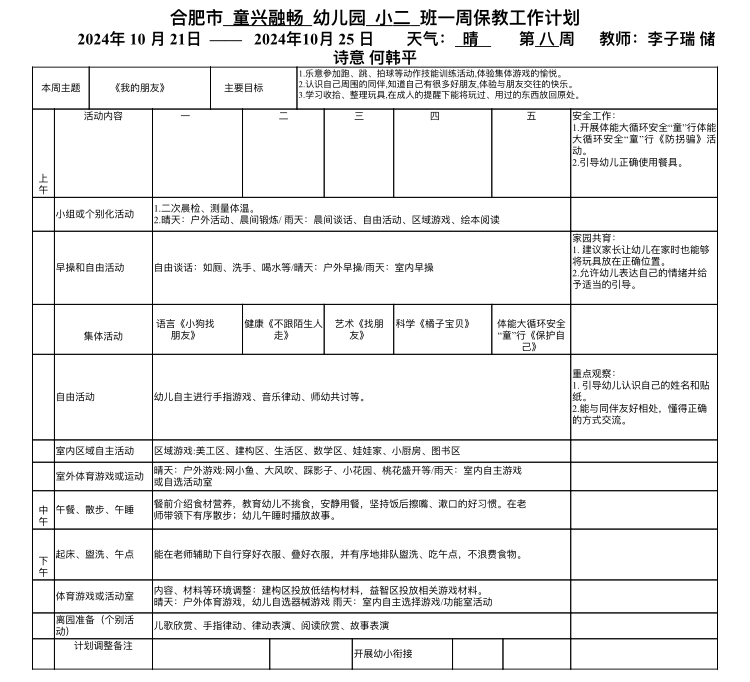 廬陽教育發(fā)展集團(tuán)童興融暢園:小班第八周保教工作計(jì)劃