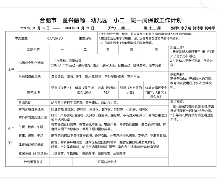 廬陽(yáng)教育發(fā)展集團(tuán)童興融暢園:小班第十二周保教工作計(jì)劃