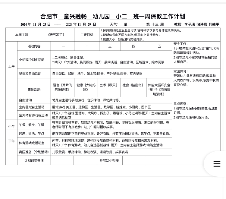 廬陽(yáng)教育發(fā)展集團(tuán)童興融暢園:小班第十三周保教工作計(jì)劃