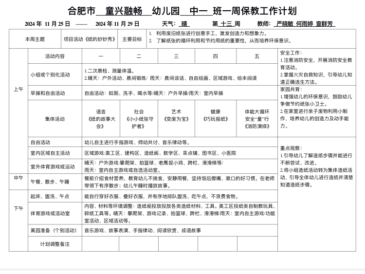 廬陽教育發(fā)展集團(tuán)童興融暢園:中班第十三周保教工作計劃